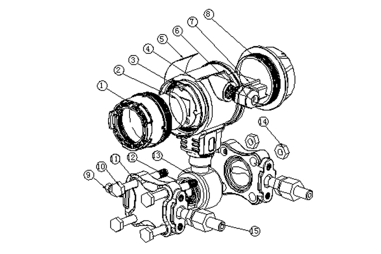 | 1.表头前盖 2. 前盖镜片 3.表头 4.壳体 5.铭牌标签 6.防爆接头 7.接线端子 8.表头后盖 9.放泄阀 10. 螺栓 11.夹板 12.传感器密封圈 13.传感器 14.螺母 15.焊管接头组件 |