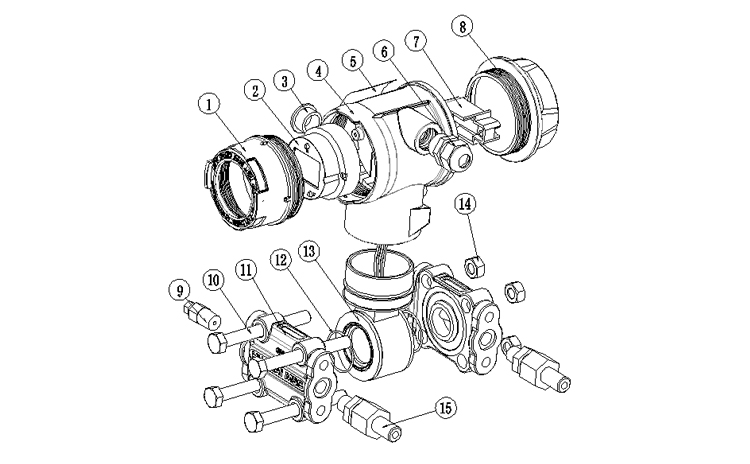 | 1.表头前盖 2.表头 3.金属闷盖 4.壳体 5.铭牌标签 6.防爆接头 7.接线端子 8.表头后盖 9.放泄阀 10.螺栓 11.夹板 12.传感器密封圈 13.传感器 14.螺母 15.焊管接头组件 |
