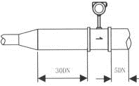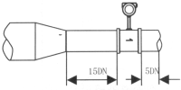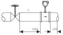 涡街流量仪表对安装点的上下游直管段有一定要求,否则会影响介质在管道中的流场,影响仪表的测量精度。仪表的上下游直管段长度要求见图(三) DN为仪表公称口径 单位:mm