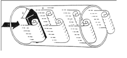 在流体中设置非流线型旋涡发生体(阻流体),则从旋涡发生体两侧交替地产生两列有规则的旋涡,这种旋涡称为卡曼旋涡,如图(一)所示。