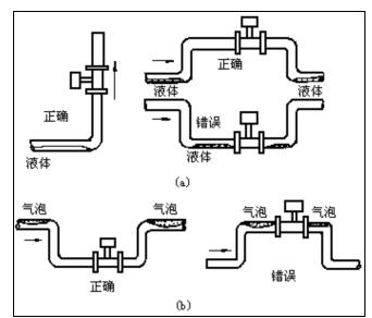 测量液体时,为了保证管内充满液体,所以在垂直或倾斜管道安装仪表时,应该保证液体流动方向从下而上。若管道内含少量气体,为了防止气体进入仪表测量管,仪表应安装在管线的较低处