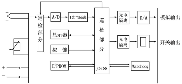 | 智能巡测报警仪表是由巡回测量回路,数字面板表、调节器和电源部分组成。稳压电源将220V市电转换成稳定的直流电压作为其它部分电源。巡回测量回路则是将被测回路中的一路选定后送给A/D转换后输送到JC-588专用中央处理器进行处理后,不仅要送到数字面板表,而且也要送到调节器,与设定值比较后按调节规律输出控制或报警信号。 |